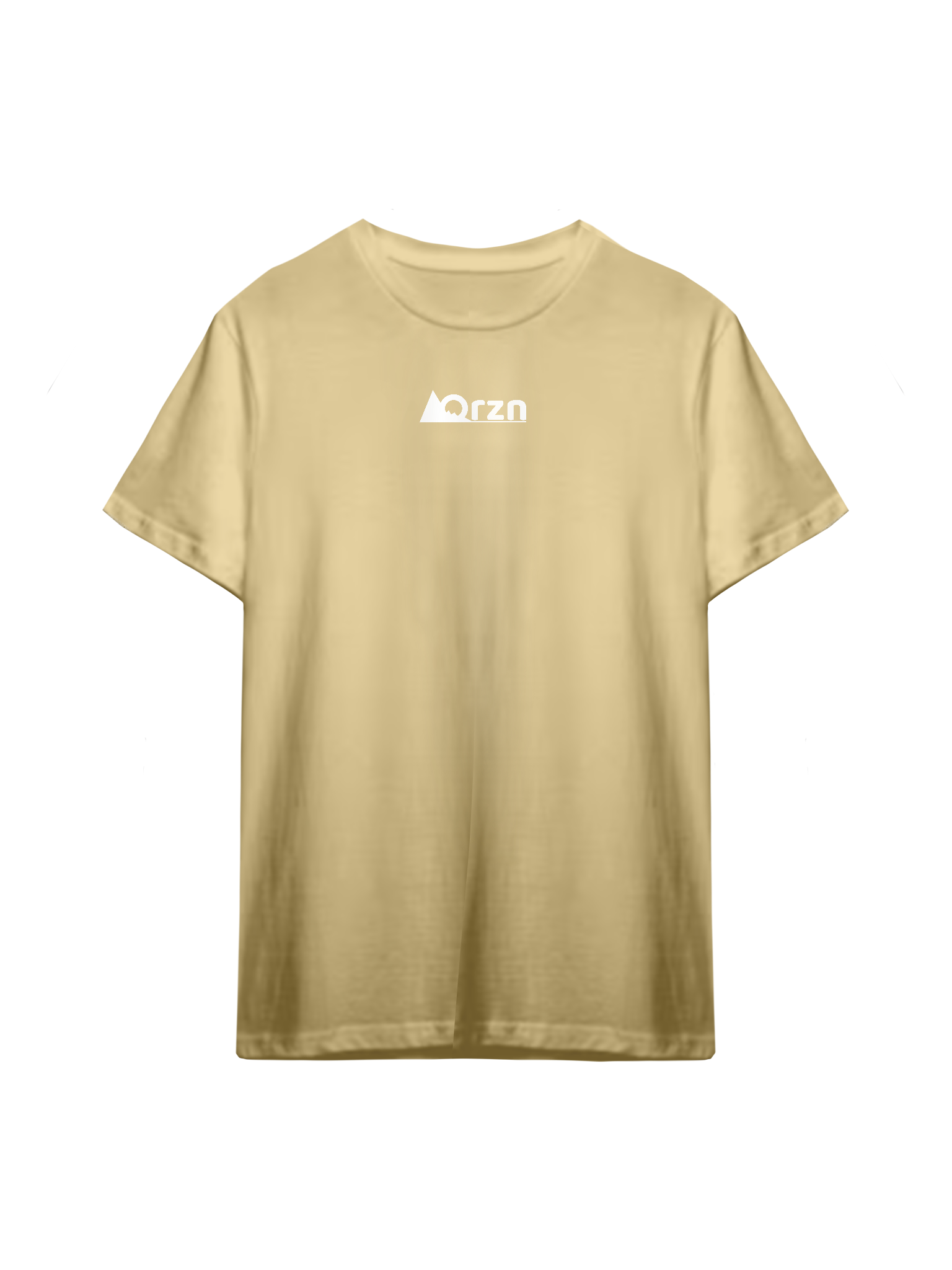 Logo Orzn posizionato centralmente o in alto a destra, con colorazione coordinata al colore della t-shirt
